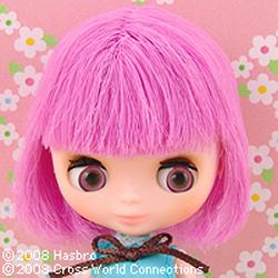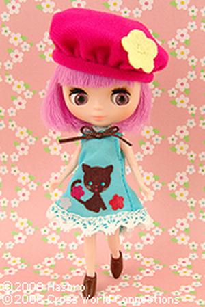 The Neo Blythe wore a red dress and had light blue hair to create a unique and cute style, and this Petite Blythe is coordinated with soft colors to match her fuchsia pink hat.