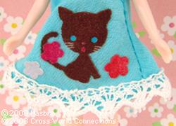 アウトフィットは水色のワンピースに、レトロな雰囲気のブラウンの猫をプリント。