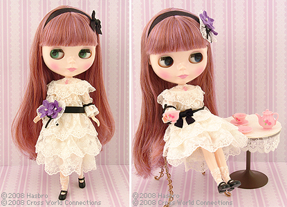 [ The set includes ] Doll, dress, inner dress, headdress, flower ornament, ribbon, drawers, socks, shoes, tea cups (2), saucer (2), tea pot, and stand.