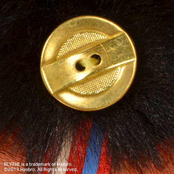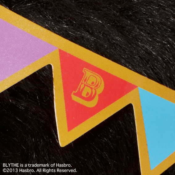 アゴ下にかかるカラフルなストライプリボンや、ゴールドカラーのボタンを飾って華やかな雰囲気に仕上げました。