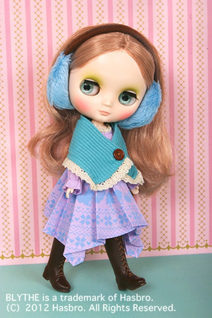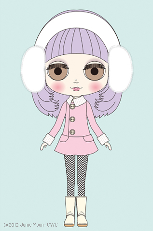 Her fashion is color-coordinated to match the glory of her hair color. She has a bay pink jacket with contrasting white collar and cuffs. The jacket has an asymmetrical opening with skirted bottom. She has faux fur white earmuffs and white boots. She's all dressed up to the visit a snowy city. Her bold black and white herringbone tights bring a fun fashion pop to her look.
