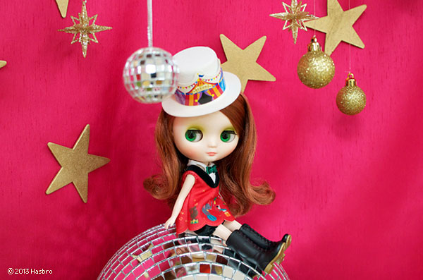 Her pants are a special pumpkin shape in black satin. Her top hat has the image of the big top wrapped around it.