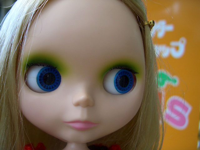 最大の特徴は後頭部から出ているひもを引っぱると、瞳が グリーン、ピンク、ブルー、オレンジへと変わるアイギミックといわれる仕掛けのある大きな目です。