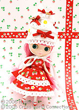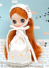 「ラストキス」では、優しくて儚いジュリエットに捧げるウェディングドレスをテーマにデザインしました。森で行なわれる結婚式をイメージしたドレスは、すずらんや花のつぼみがドレスに刺繍されています。また、ヘッドドレスはマーガレット をイメージしたモチーフがちりばめられ、可憐なプチブライスの表情をひきたてます。